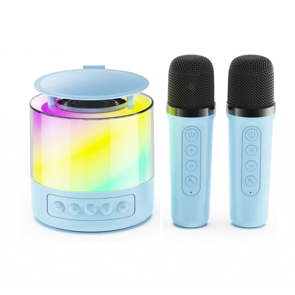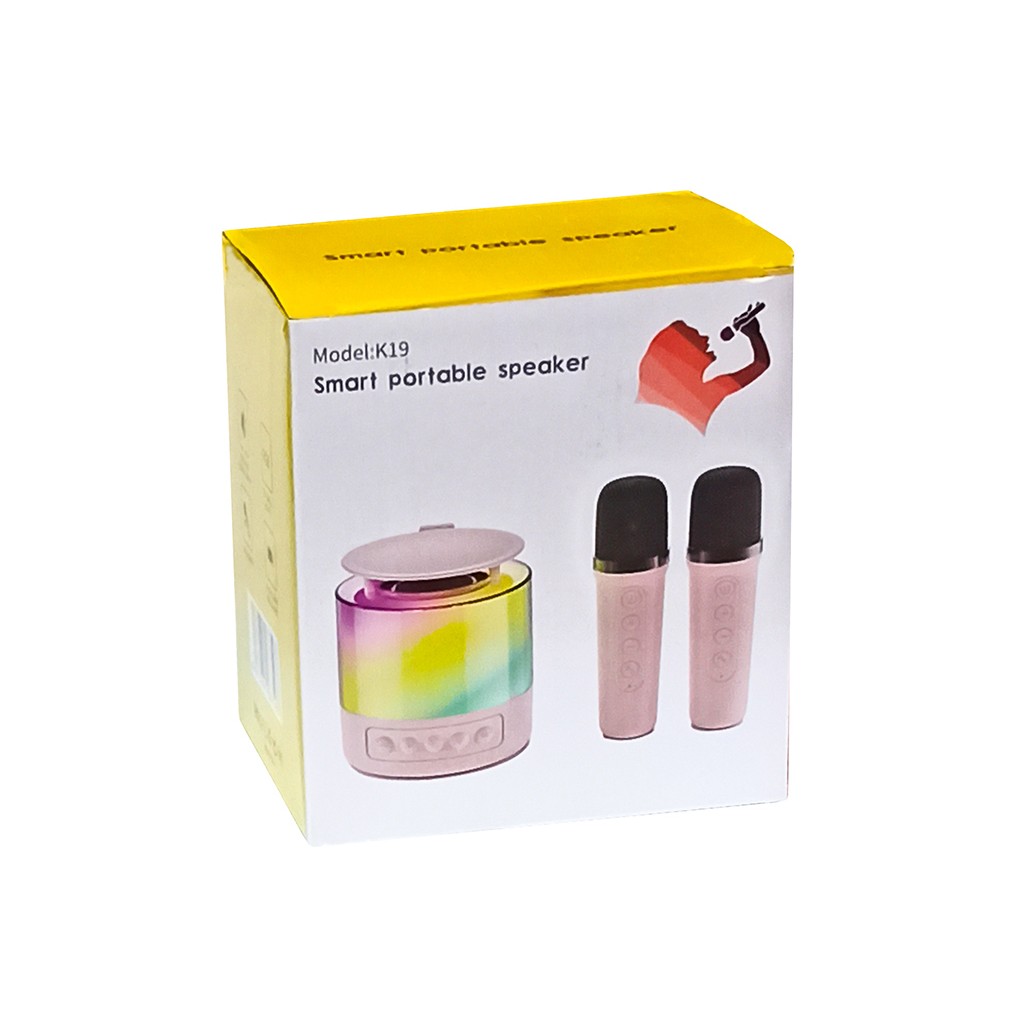 Блютуз колонка K19 – портативная колонка с 2-мя беспроводными микрофонами. Воспроизводит по Bluetooth, карт памяти microSD, с AUX входа, имеет яркую подсветку. Мощность 5 Вт.