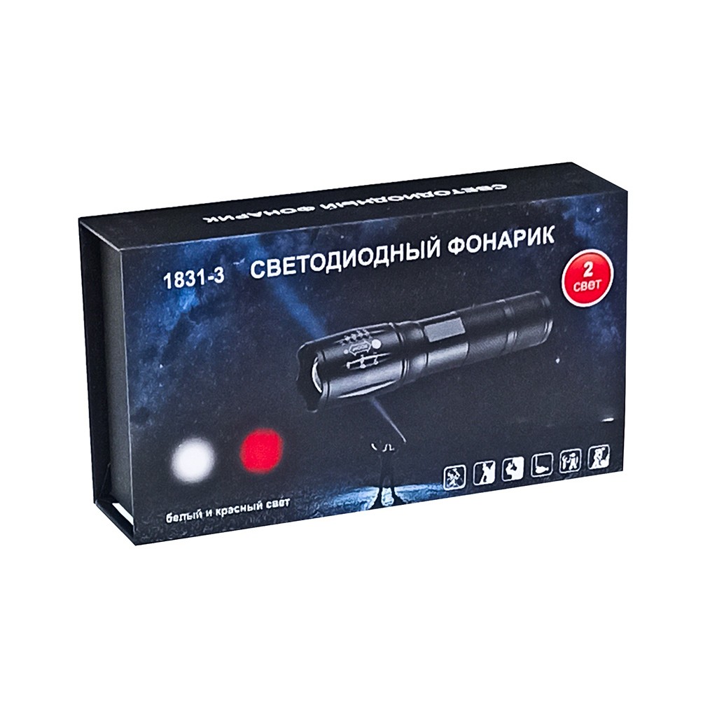 Фонарик BL-1831-3 - светодиодный фонарь со съёмным аккумулятором, с белым и красным светом и с мощным светодиодом и линзой для фокусировки.