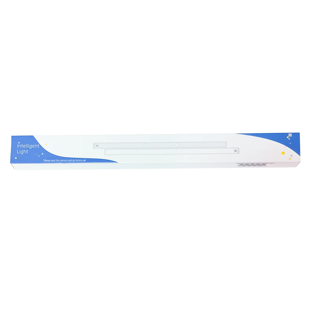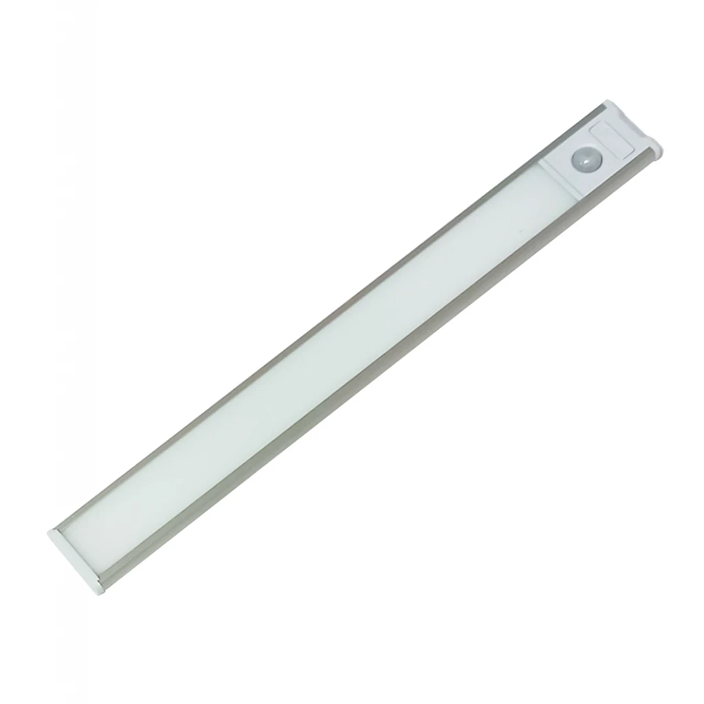 Лед лампа на аккумуляторе с датчиком движения – led лампа со встроенным аккумулятором для подсветки шкафов, ящиков, гардеробных, рабочих поверхностей и можно использовать как ночник. Его длина составляет 30 см, материал корпуса – алюминий. Светильник накладного типа, легко крепится с помощью комплектного магнита с двусторонним скотчем, не требует специальных инструментов. Работает от встроенного аккумулятора, который легко заряжается от USB. Благодаря встроенному датчику движения светильник автоматически включается при приближении и выключается, когда движение прекращается. Светодиодный светильник может гореть постоянко или при включении сенсора светит 30 сек. Сенсор включается двойным нажатим на кнопку <вкл>. Также в светильнике есть 4 вида света – от теплого до холодного, и также можно менять яркость освещения.