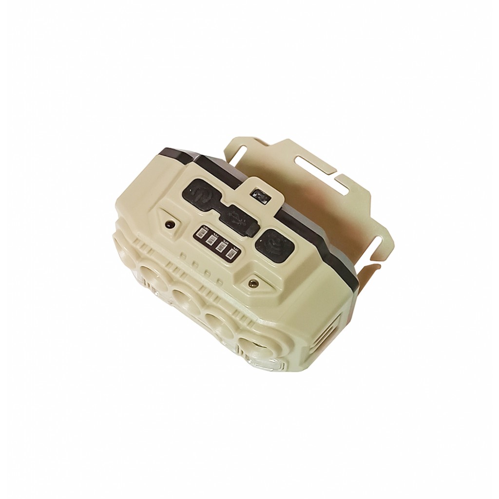Фонарик налобный на аккумуляторе имеет светлый пластиковый корпус, крепкий. В верхней части корпуса расположены 5 светильнтков со светодиодами ХРЕ, которые имеют сфокусированный луч, применяются при дальнем освещении. в нижней части - светильник СОВ, он имеет яркий рассеянный свет и используется при ближнем свете. По бокам - лампы стробоскопа, с синим и красным светом.