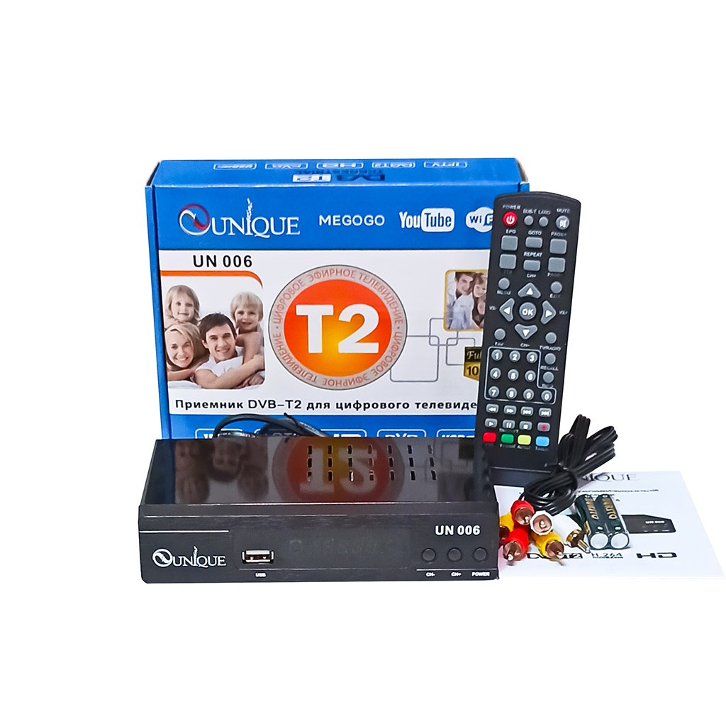 Тюнер Т2 Unique UN 006 - цифровая эфирная Т2 приставка в металлическом корпусе. Тюнер сочетает в себе функции Т2 ресивера и медиа проигрывателя. Тюнер воспроизводит с USB флешек аудио- и видео файлы в качестве FullHD, есть возможность подключения к Wi-Fi, встроены приложения IPTV, Megogo.