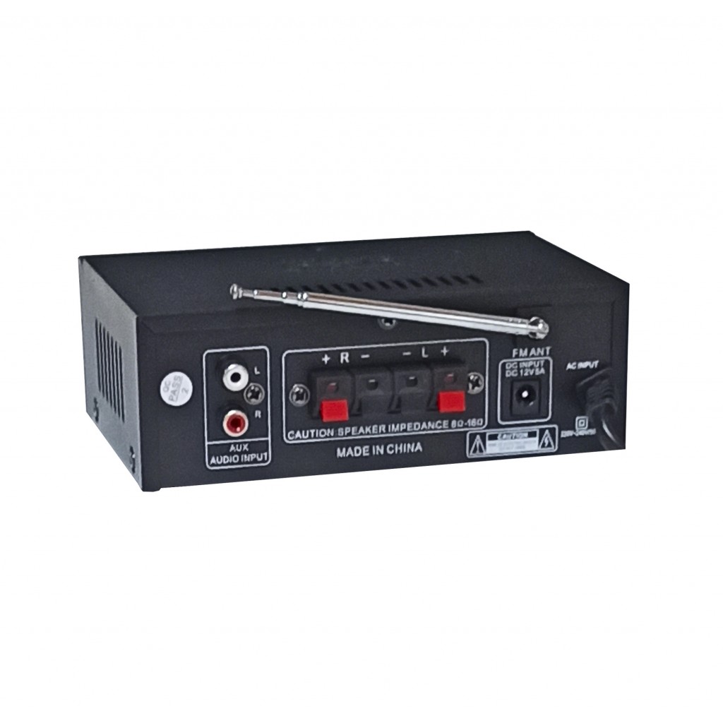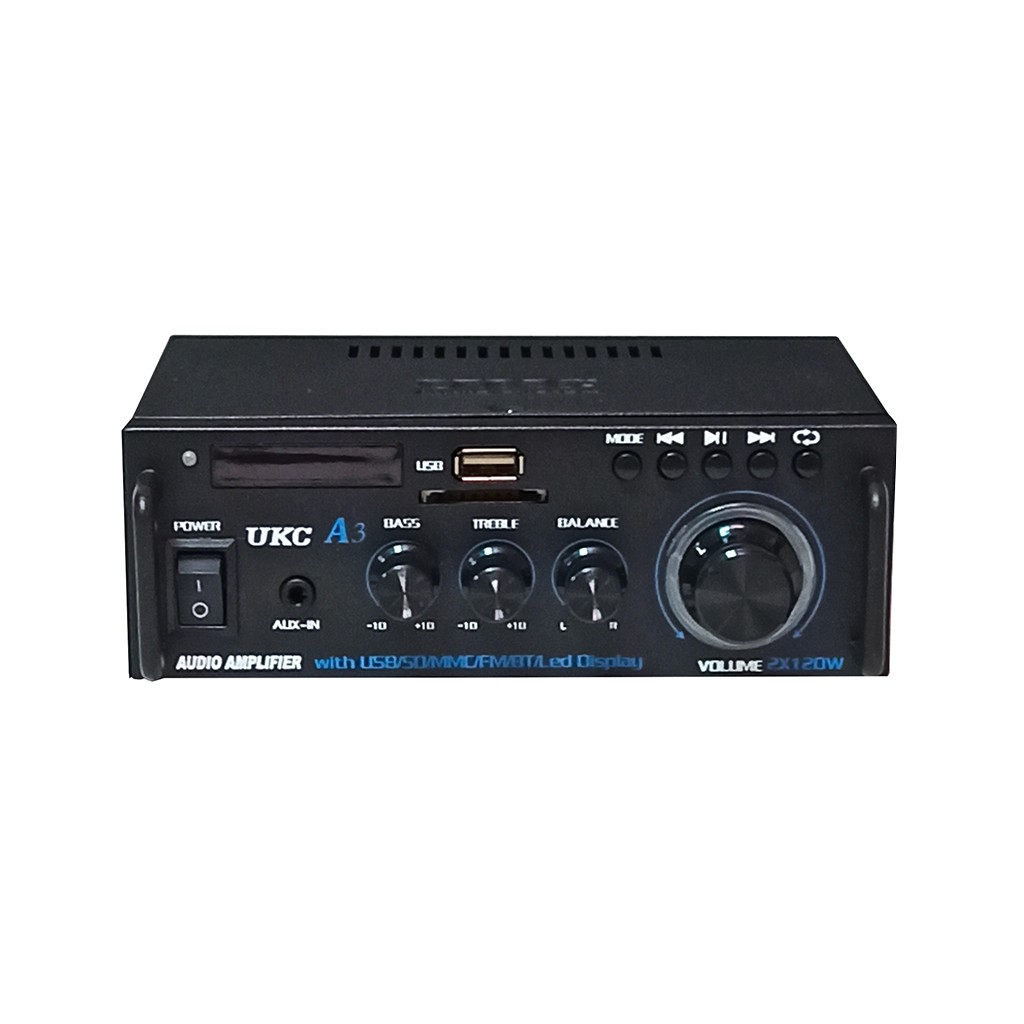 Усилитель звука UKC A3 – усилитель для колонок с Bluetooth модулем, со встроенным медиаплеером, с поддержкой воспроизведения с USB флешек, карт памяти SD, встроенным FM тюнером. Усилитель работает от сети 220V или от 12V, комплектуется пультом ДУ. Усилитель обеспечивает выходную мощность по 25 Вт на каждый из каналов при нагрузке 8 Ом.