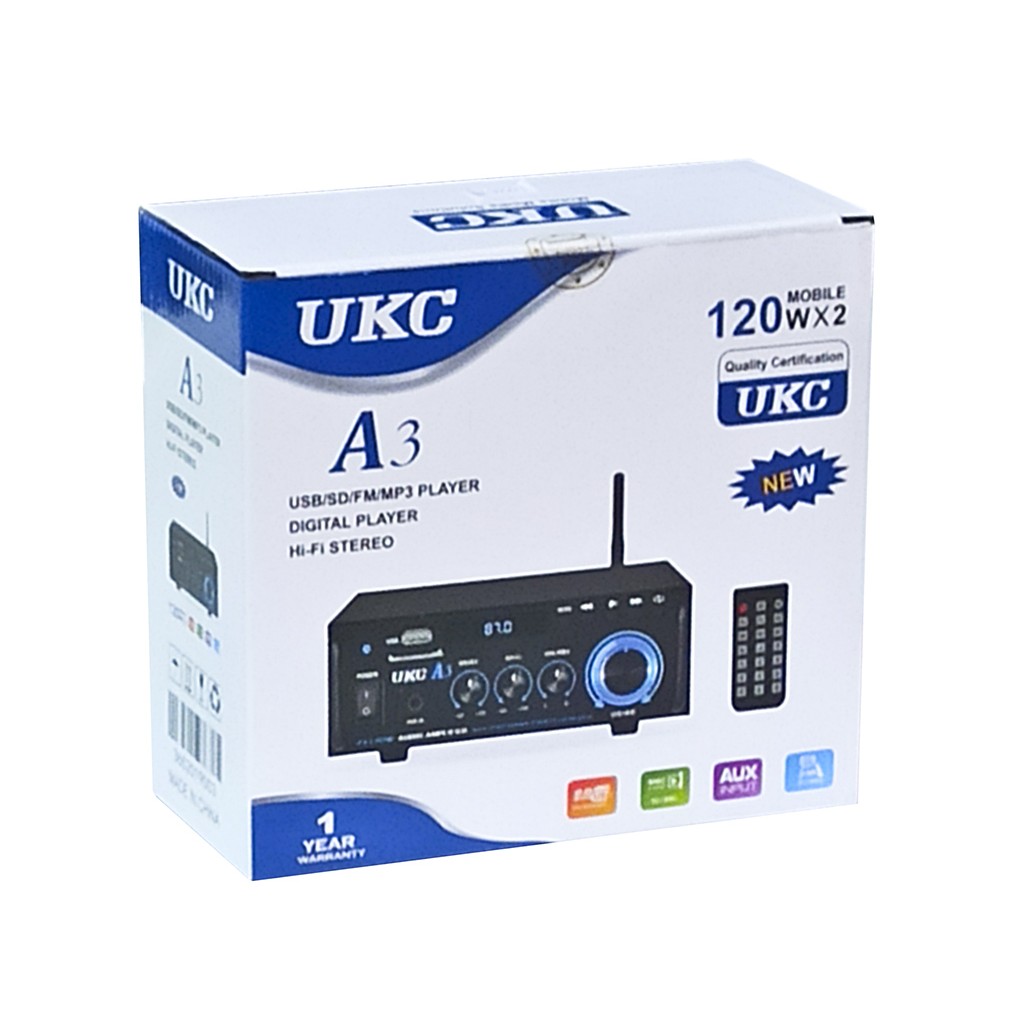 На передней панели усилителя звука для колонок UKC A3 расположены регуляторы громкости - кнопочный и поворотный, регуляторы тембра низких и высоких частот, регулятор баланса, кнопка включения и аудиовход AUX-in с разъёмом mini jack 3.5 мм. В верхней части расположены кнопки управления медиаплеером, светодиодный дисплей и 2 входа – USB и Cardreader. На задней панели UKC A3 расположены аналоговый вход 2RCA, пружинные зажимы для подключения акустики, FM антенна, гнездо 5.5*2.1 мм для подключения адаптера 12V 5A или аккумулятора и сетевой встроенный кабель 220V.