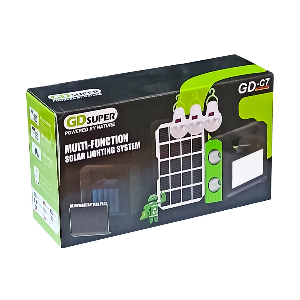 Зарядная станция GD Super GD-C7 – портативная система автономного освещения и зарядки. Портативная зарядная станция состоит из станции со встроенными мощными светодиодным фонарями и лампой, солнечной панели и 3-х led ламп. Автономная солнечная станция служит для зарядки устройств и освещения помещений. Сама зарядная станция имеет мощность 30 Вт, у неё встроенные аккумуляторы 18650 на 4000 мАч, которые заряжаются от солнечной панели мощностью 3,5 Вт. GD Super GD-C7 имеет два светодиодных фонаря высокой яркости с несколькими режимами свечения, есть светодиодный индикатор зарядки. В комплект входят 3 дополнительных LED-лампы с длинными кабелями и выключателями, которые можно использовать для освещения нескольких зон одновременно. В комплекте также идёт шнур-переходник 5 в 1 с USB на штекеры 5,5*2,1 мм, USB Type-C, microUSB, miniUSB и 2,5*0,7 мм.