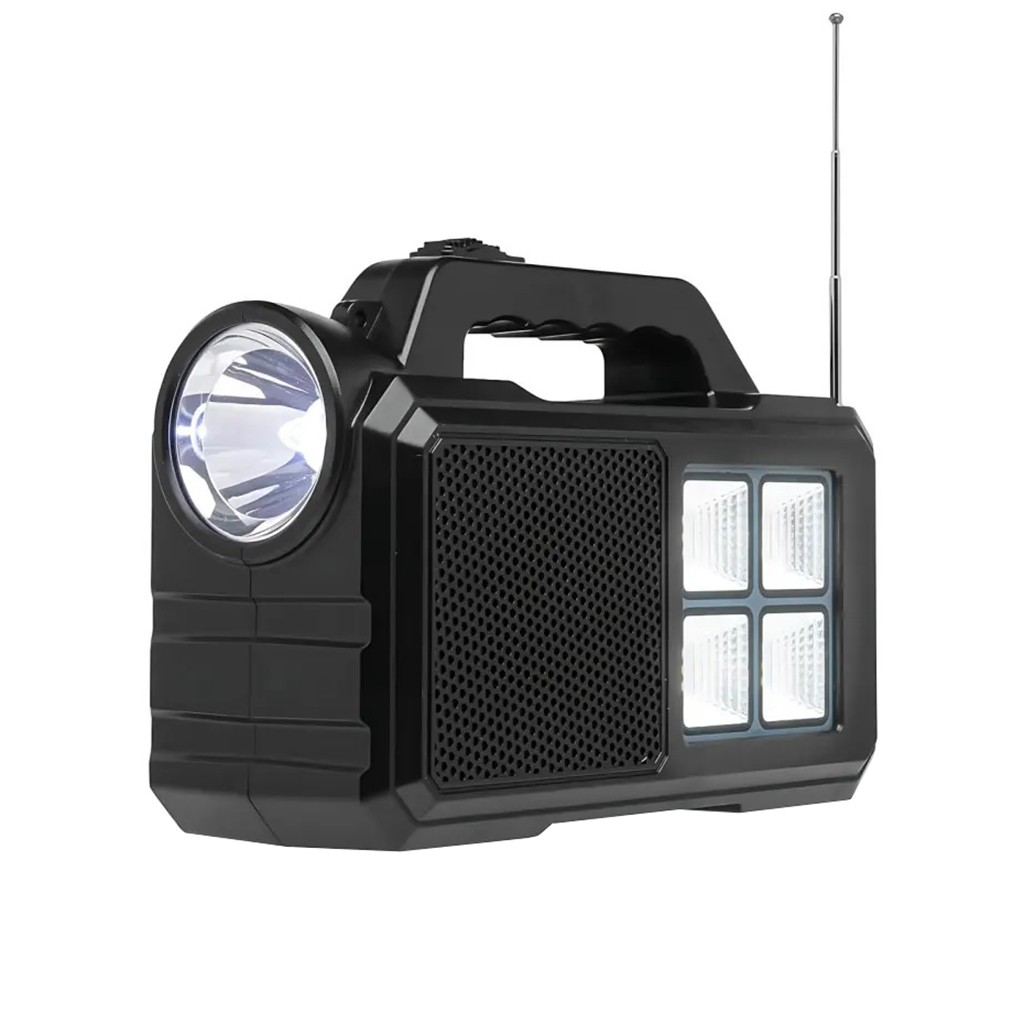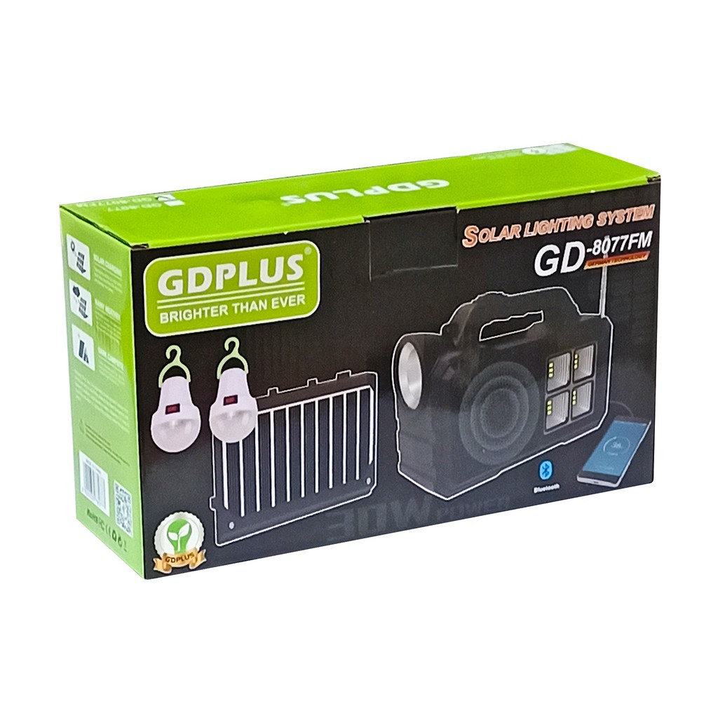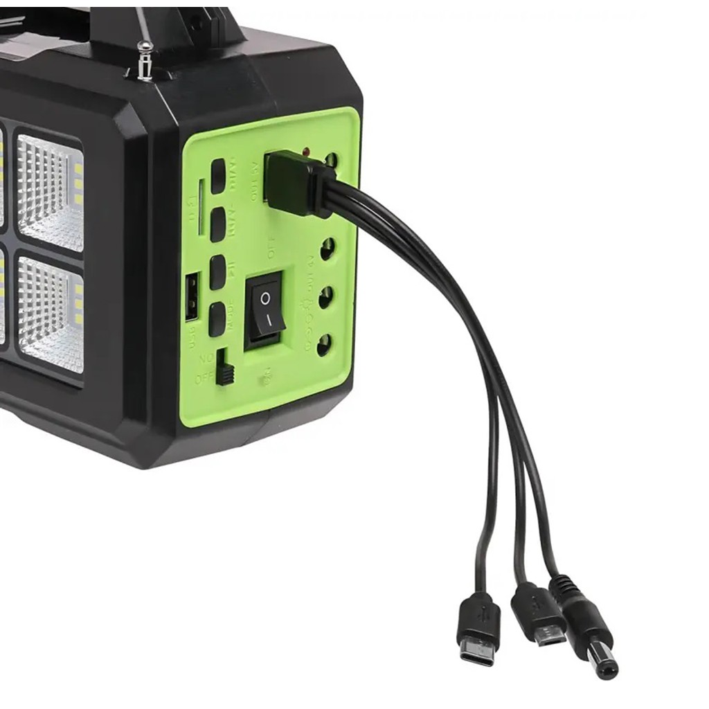 Зарядная станция GDPlus GD-8077FM – портативная система автономного освещения и зарядки, есть FM радио. Солнечная зарядная станция состоит из станции со встроенным мощным светодиодным фонарём, лампой, солнечной панелью и 2-х led ламп. Автономная солнечная станция служит для зарядки устройств и освещения помещений – выполняет роль павербанка и большого фонаря. Сама зарядная станция имеет мощность 30 Вт, у неё встроенные аккумуляторы 18650 на 4000 мАч, которые заряжаются от солнечной панели мощностью 3,5 Вт. Также станцию можно заряжать и от USB или USB адаптера 5V 1-3A, подключив комплектный кабель во вход 5,5*2,1 мм. GDPlus GD-8077FM имеет 2 светодиодных фонаря высокой яркости с несколькими режимами свечения, есть светодиодный индикатор зарядки. В комплект входят 2 LED-лампы с длинными кабелями и выключателями, которые можно использовать для освещения нескольких зон одновременно. В комплекте также идёт шнур-переходник 3 в 1 с USB на штекеры 5,5*2,1 мм, USB Type-C и microUSB.